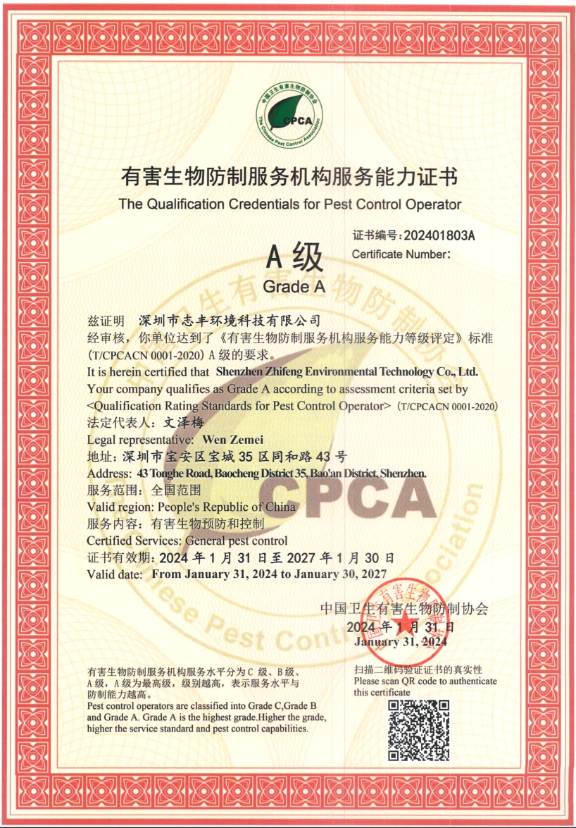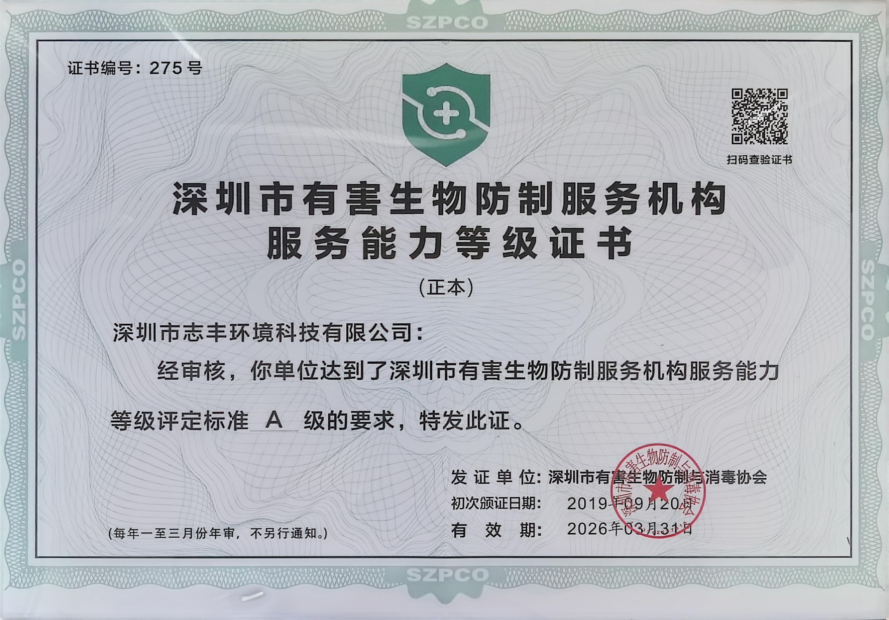 10年專注病媒生物防治,擁有“深圳市病媒生物防治服務機構服務能力A級證書”,驗收標準嚴于國家標準,連續3年深圳市有害生物防治協會授予“先進企業”。